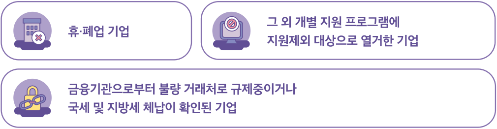 * 단, 신용회복위원회의 프리워크아웃, 개인워크아웃 제도에서 채무조정 합의서를 체결한 경우, 법원의 개인회생제도에서 변제계획 인가를 받거나 파산면책 선고자, 회생인가를 받은 기업, 재기컨설팅 신청기업은 지원 가능